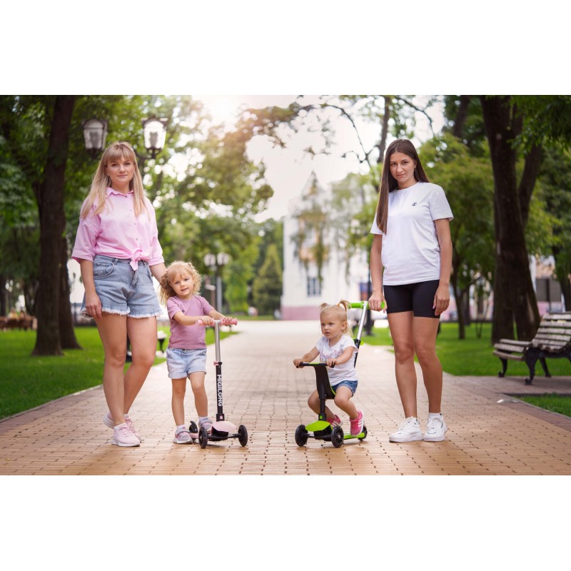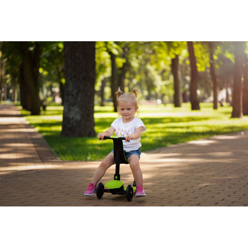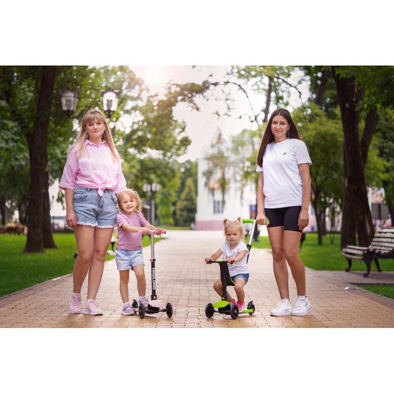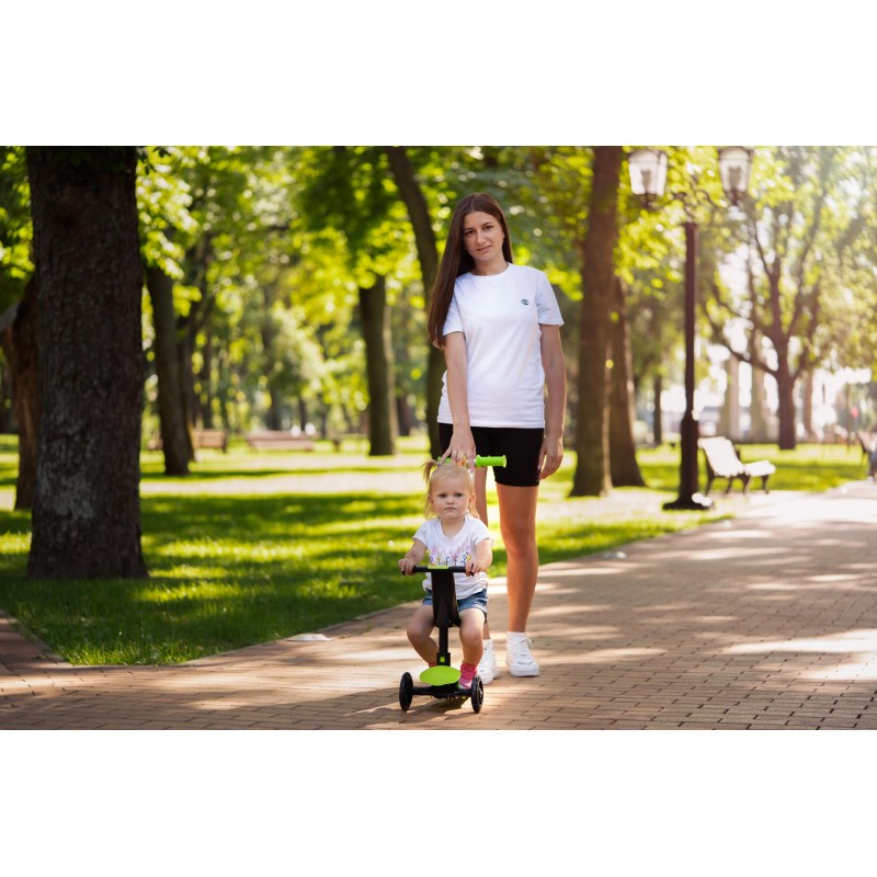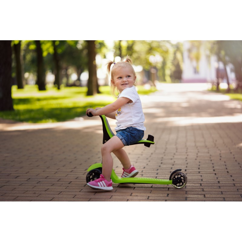 У варіанті 3-колісного самокату дитина розміщується стоячи на деці і керує самокатом самостійно.