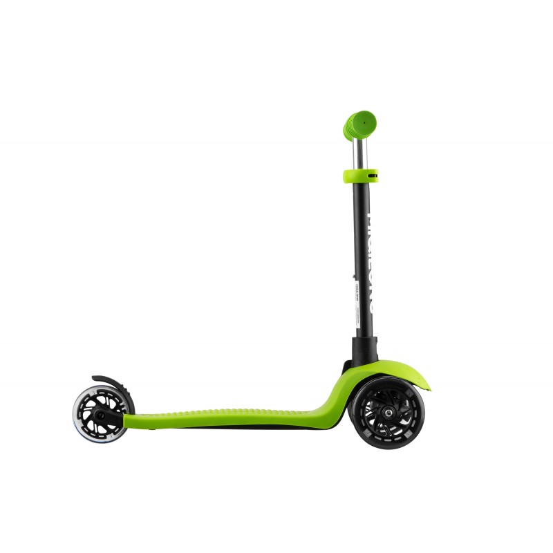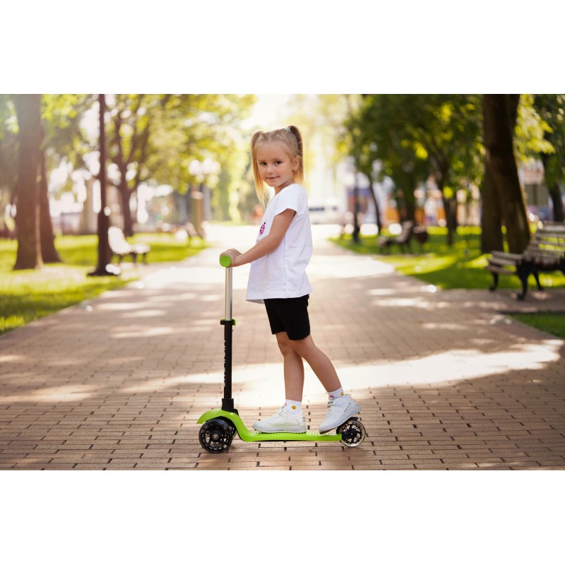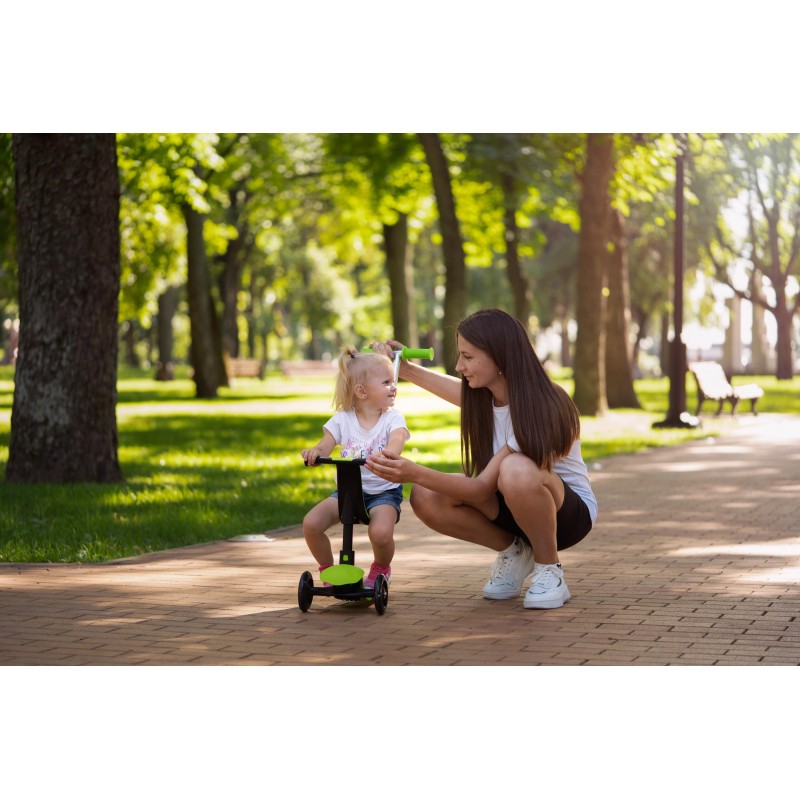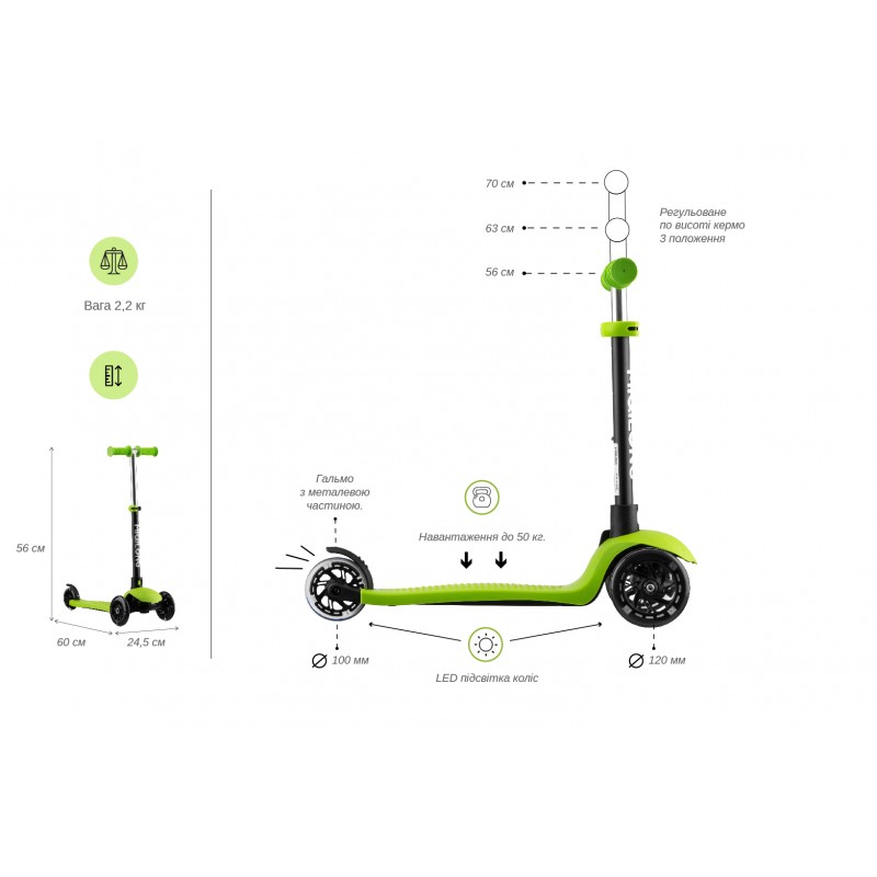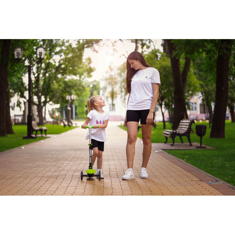 У варіанті 3-колісного самокату дитина розміщується стоячи на деці і керує самокатом самостійно.