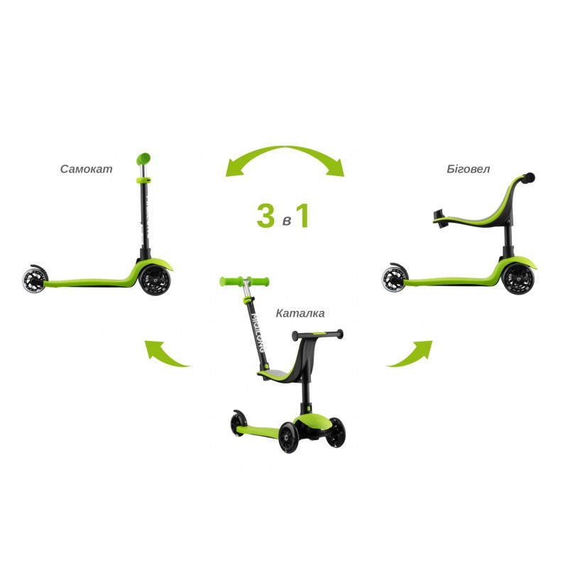 У варіанті біговела дитина розміщується сидячи на сидінні і сама управляє штовханням та напрямком їзди. (рекомендується від 18 місяців)