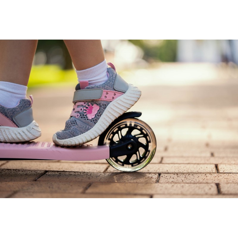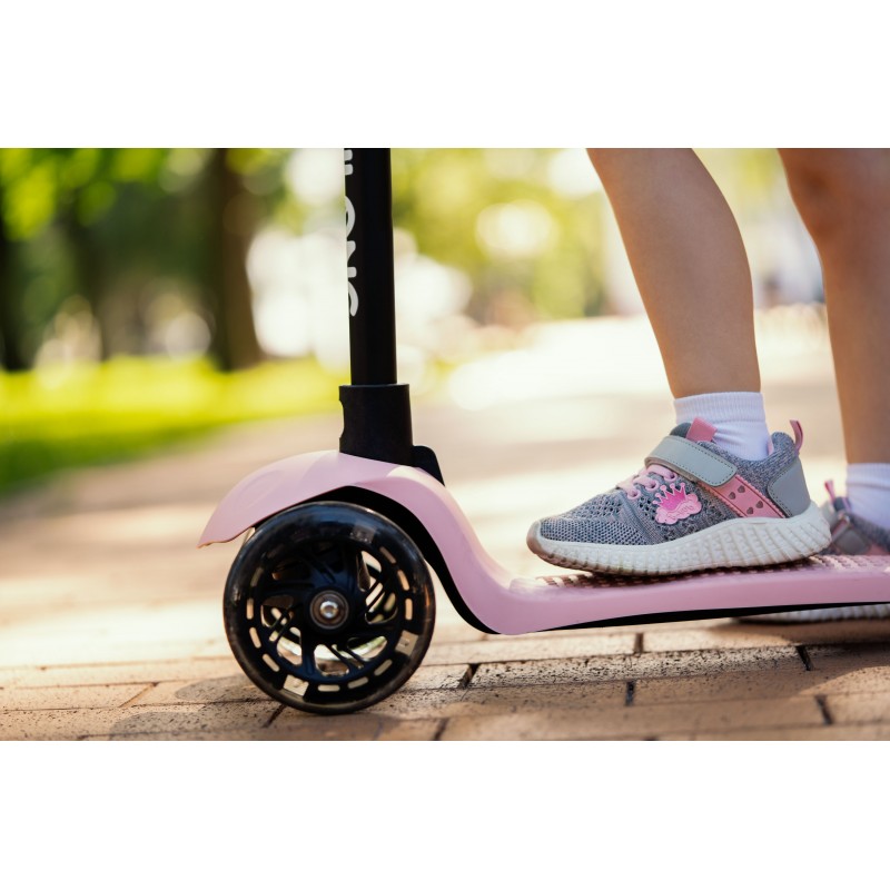 Заднє колесо має надійне ножне гальмо з металевою вставкою. Поліуретанові колеса мають LED-підсвічування.