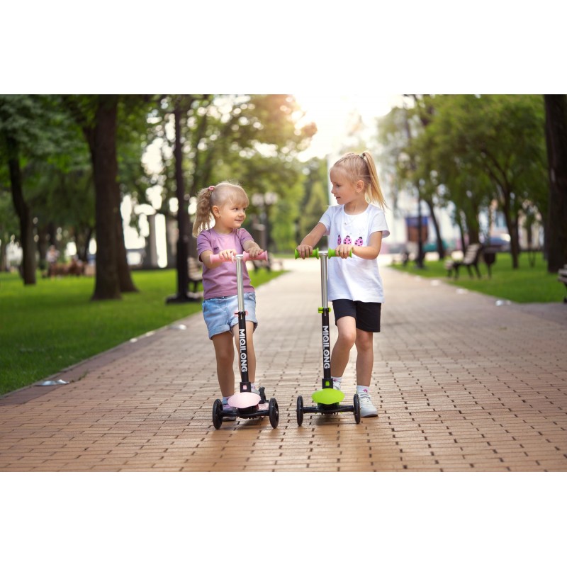 У варіанті 3-колісного самокату дитина розміщується стоячи на деці і керує самокатом самостійно.