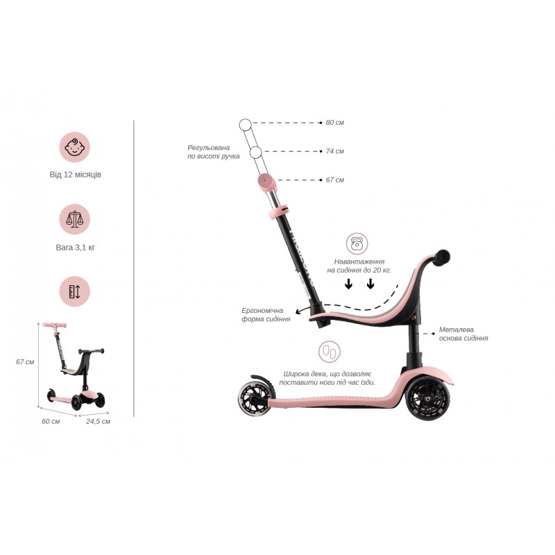 У варіанті біговела дитина розміщується сидячи на сидінні і сама управляє штовханням та напрямком їзди. (рекомендується від 18 місяців)