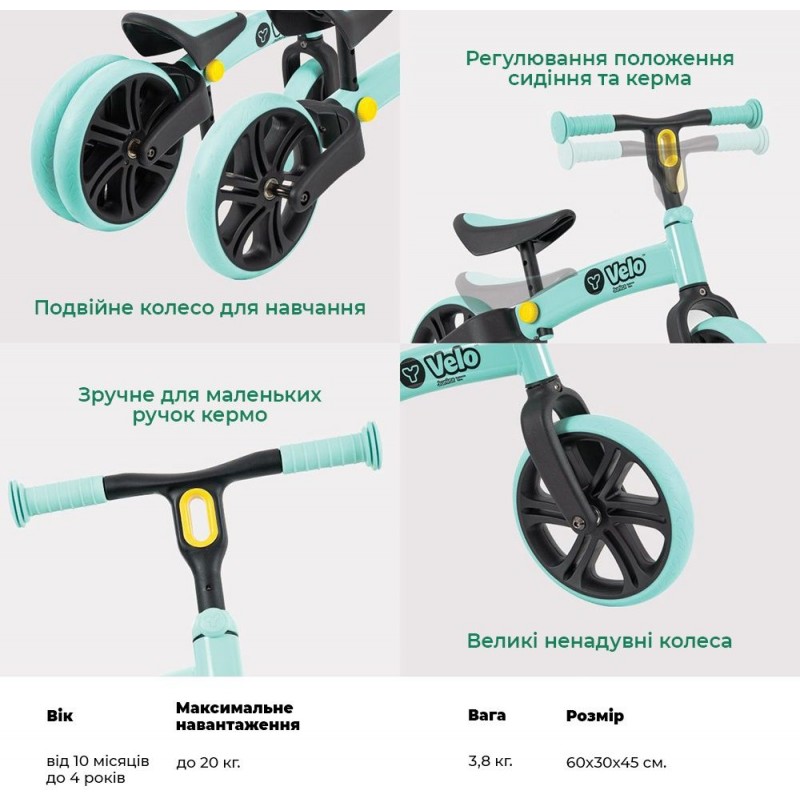Для найменших користувачів у конструкції передбачений режим навчання. Він реалізується за допомогою заднього подвійного колеса, що дає більшу стабільність. Це дозволить дитині з перших днів самостійно керувати біговелом без залучення сторонньої допомоги. Ведучи, їзда на біговелі стає інтуїтивно зрозумілою та простою. А батьки можуть бути впевнені в безпеці своєї дитини, оскільки конструкція досить стійка.