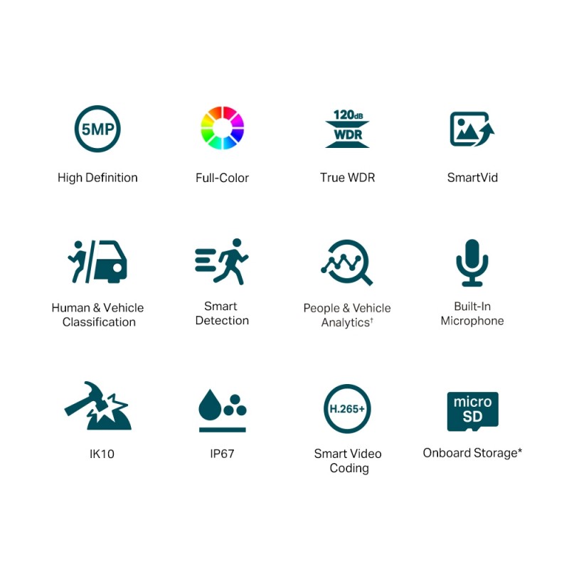 Контролюйте 24-годинні чіткі та барвисті деталі навіть у непроглядну темну ніч. Кольорова камера VIGI забезпечує максимальну роздільну здатність 5 Мп і забезпечує барвистий моніторинг за допомогою об'єктива з великою діафрагмою, високочутливого датчика та прикріплених додаткових ліхтарів.