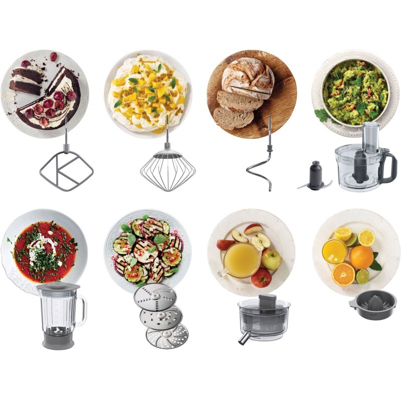 Змішування, замішування та збивання. Нарізає, тре на тертці та подрібнює. Він поєднує в собі таланти кухаря і кондитера. Ви можете доручити йому будь-яке завдання.