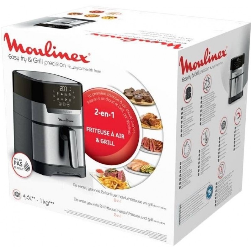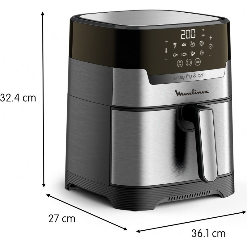 Мультипіч Moulinex EasyFry&Grill Digital з потужністю 1550 Вт та чашею об'ємом 4,2 л розрахована на приготування страв для 6 порцій у сірому пластиковому корпусі. Технологія Extra Crisp забезпечує циркуляцію потоків гарячого повітря з температурою 80-200 °C для хрустких результатів. Сенсорне керування пропонує 8 автоматичних програм: картопля фрі, курка, нагетси, риба, м'ясо, піца, овочі, десерт, а також 2 ручних режими аерофритюр та гриль. Аксесуари охоплюють двосторонню решітку-гриль з литого алюмінію, придатну для очищення в посудомийній машині, з функціями сушіння, звукового сигналу, регулювання температури та таймера. Електронна книга рецептів додає зручності у використанні.
