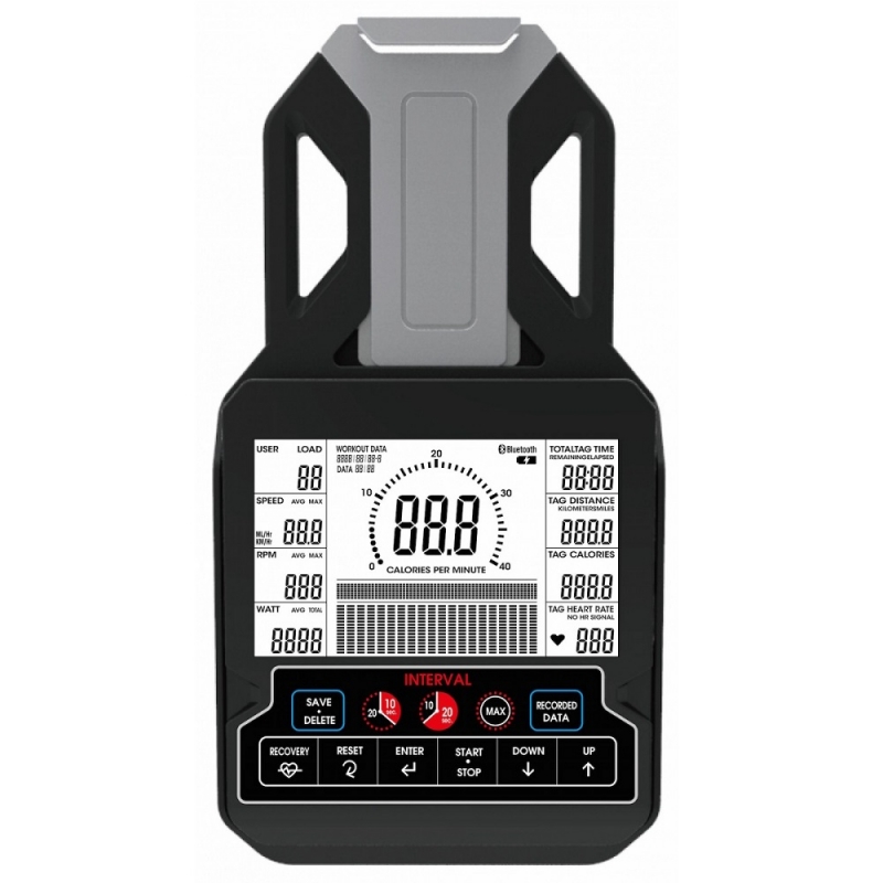 • на екрані висвічуються: графічний профіль тренування, швидкість, час, обороти в хвилину, дистанція, калорії, пульс, ВАТ, температура в приміщенні, годинник;