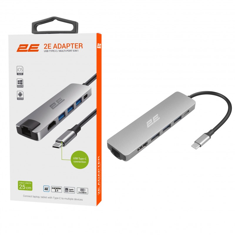 Хаб 2E USB-С > 2хUSB-A 2.0/USB-A 3.0/USB-C PD/HDMI/Ethernet, 0.15м, сірий