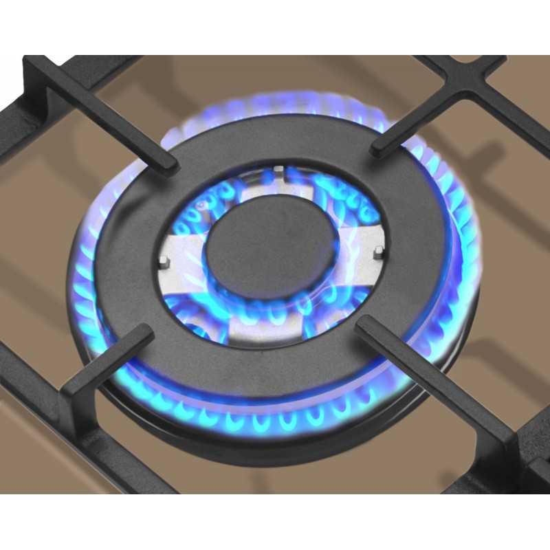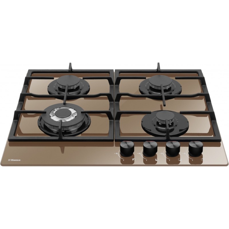Hansa BHKY61139 — газова варильна поверхня розміром 59×52 см із корпусом з бежевого загартованого скла, яке легко чистити і відрізняється стильною естетикою. Модель має чотири незалежні конфорки різної потужності: дві середні потужністю 1,8 кВт, одна велика 2,8 кВт діаметром 13,8 см та одна мала на 1 кВт. Одна з середніх конфорок — WOK, із потрійним рядом полум’я для швидкого й рівномірного нагрівання великих каструль.