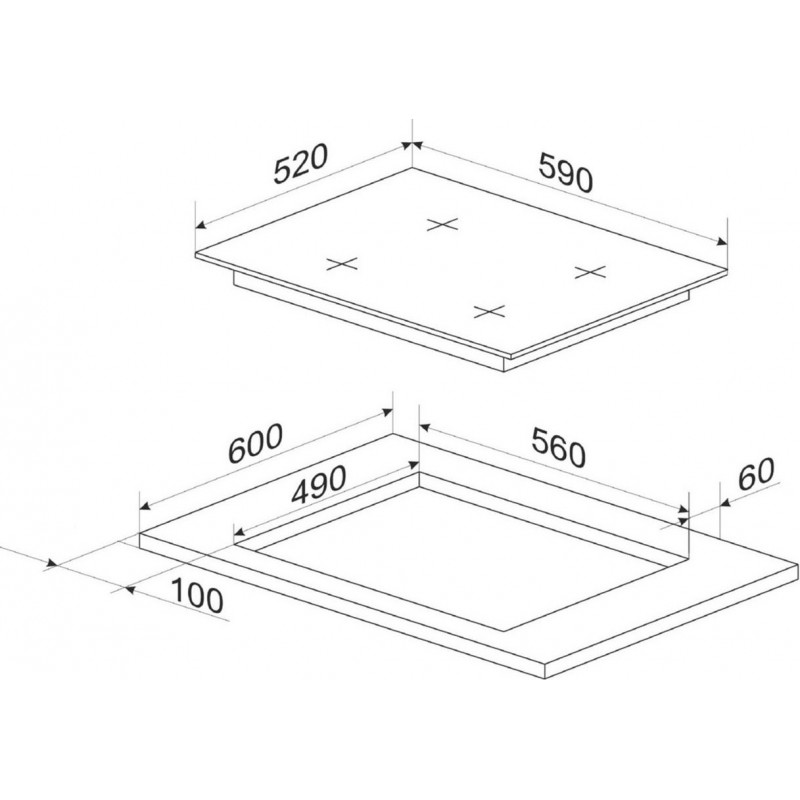 Монтаж проводиться у нішу 56×49 см при глибині 5–5,5 см. Плів управління фронтальний з поворотними регуляторами. Корпус має товщину всього 10,5 см, що дозволяє вписати варильну поверхню практично в будь-яку кухонну тумбу. Напруга живлення стандартна 220–240 В.