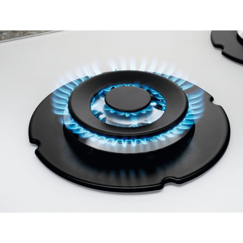 Ширина 60 см дозволяє зручно розмістити три конфорки різної потужності — для економії газу та швидкого приготування страв будь-якої складності. Поверхня виконана з міцного склокерамічного матеріалу білого кольору, що додає кухні світла й сучасного стилю. Скло стійке до подряпин, легко очищується та не боїться високих температур.