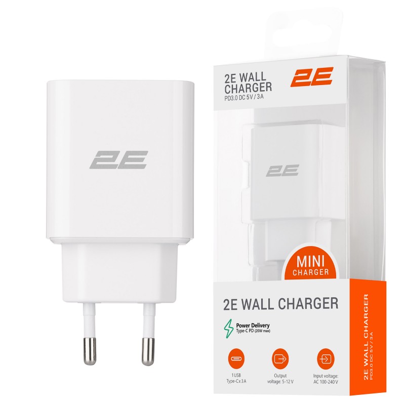 Зарядний пристрій мережевий 2E 20Вт USB-C PD, білий