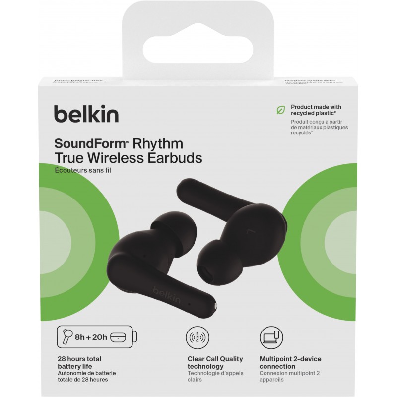 Захист від вологи за стандартом IPX5 робить навушники ідеальним вибором для тренувань або прогулянок у дощову погоду. Стильний чорний дизайн підкреслює універсальність аксесуара, гармонійно поєднуючись із будь-яким стилем. Belkin Soundform Rhythm — це ваш надійний супутник для музики, дзвінків і подкастів у будь-яких умовах.