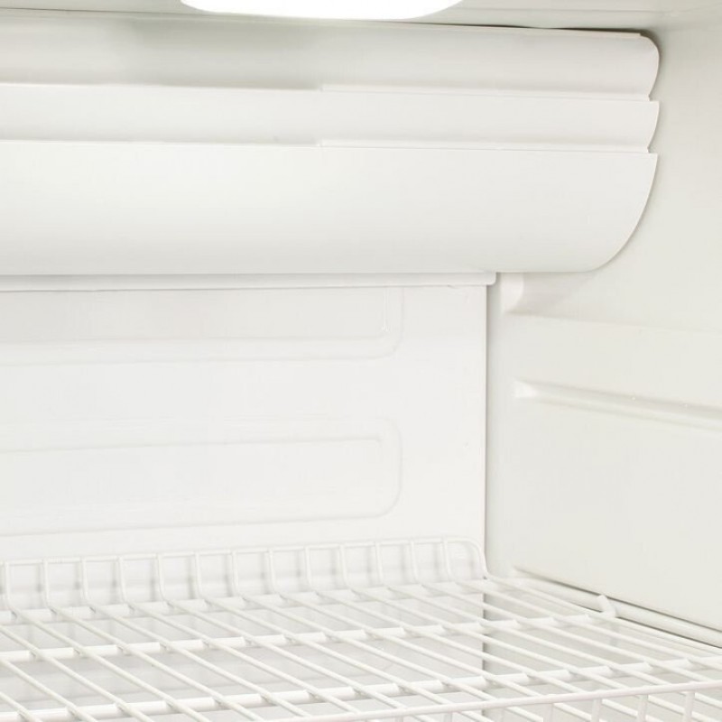 Холодильник працює досить тихо, рівень шуму складає 43 дБ. У даній моделі немає морозильного відділення. Двері холодильника виготовлені зі скла з алюмінієвою рамою. Максимально допустиме завантаження однієї полиці складає 40 кг.