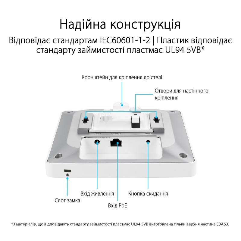 ASUS ExpertWiFi EBA63 забезпечує безперебійне підключення для різних бізнес-середовищ завдяки гнучким можливостям живлення: за технологією PoE (Power over Ethernet) і за допомогою блоку живлення змінного струму. Підключившись до комутатора або дротового маршрутизатора з підтримкою PoE, ви отримуєте живлення й канал передачі даних одним кабелем Ethernet.