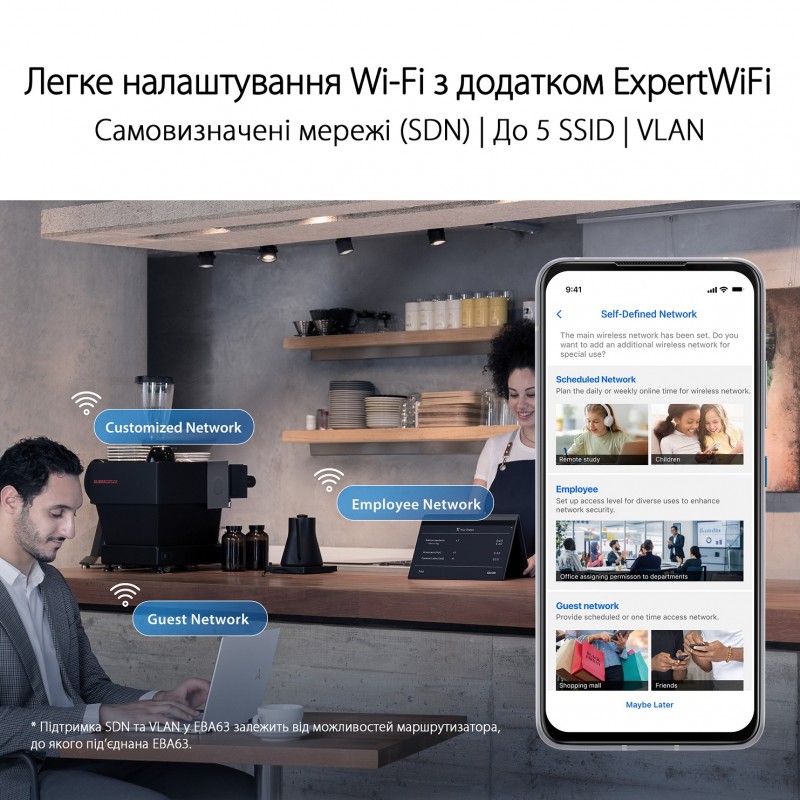 ASUS ExpertWiFi EBA63 – це рішення Power over Ethernet (PoE), яке забезпечує швидке, безперебійне й безпечне підключення до мережі та широкі функціональні можливості для малого й середнього бізнесу. Завдяки підтримці масштабованості це рішення легко адаптується до потреб вашого бізнесу.