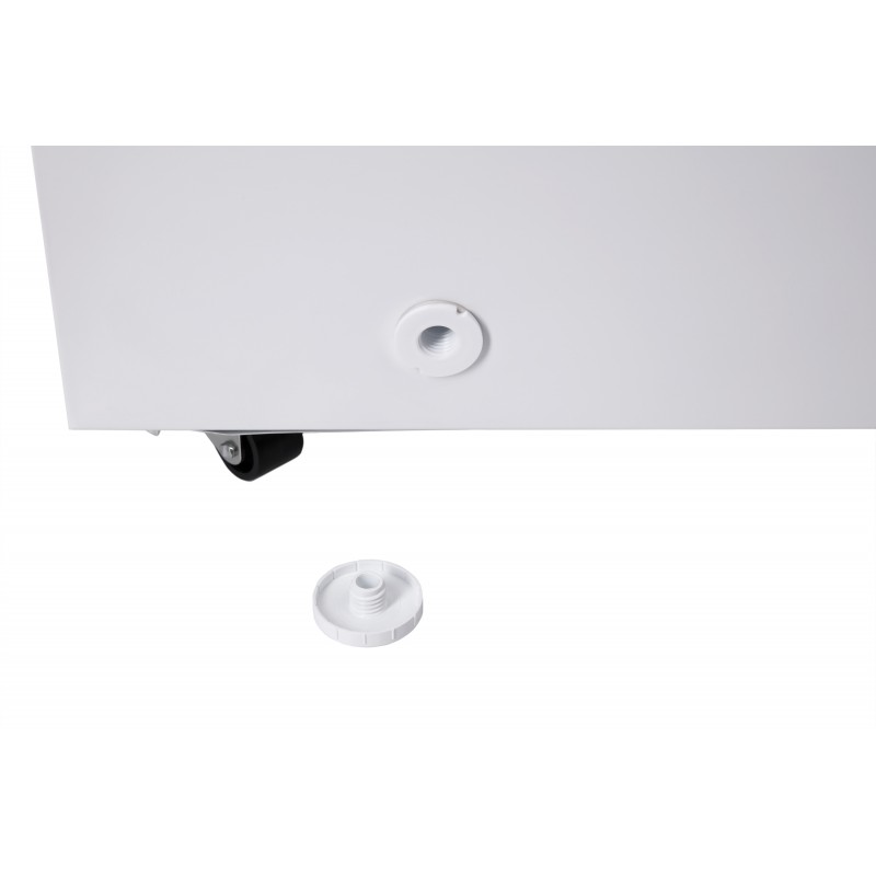 Для надійного встановлення передбачені ніжки з функцією регулювання висоти. У комплекті є дві навісні корзини та скребок для швидкого очищення від льоду. Для ручного розморожування передбачений спеціальний злив з двома кришками.