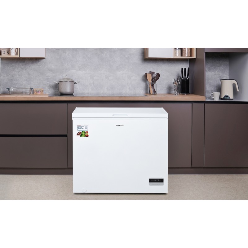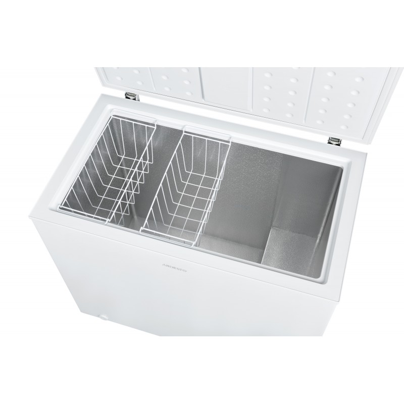 FRM-250E – середня модель в оновленій лінійці морозильних камер Ardesto. Висота морозильної камери – 85 см, ширина – 98.5 см, а вага складає 37 кг. Це оптимальний розмір для домогосподарств та магазинів великих розмірів. Повне відкриття кришки дозволяє легко контролювати внутрішній простір камери.