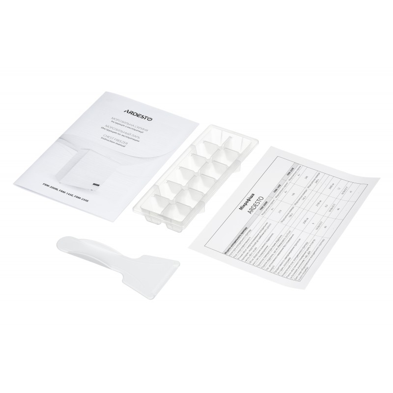 Зручне транспортування по рівній поверхні забезпечують коліщатка, а для надійної установки передбачені ніжки з функцією регулювання висоти. У комплектацію входить форма для льоду та скребок для швидкого очищення від льоду. Для ручного розморожування передбачений спеціальний злив з двома кришками.