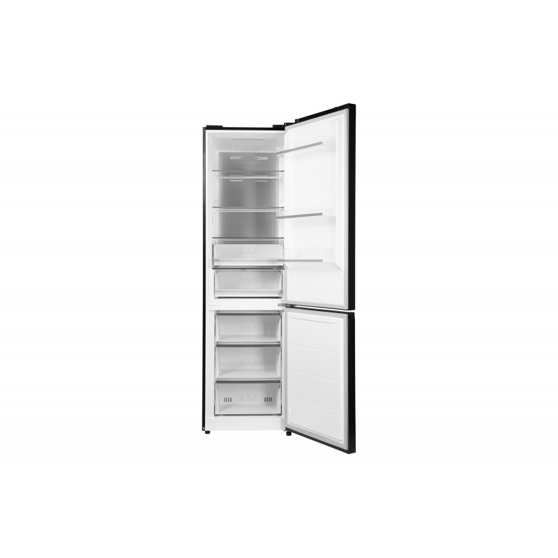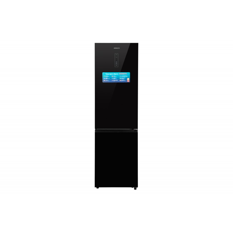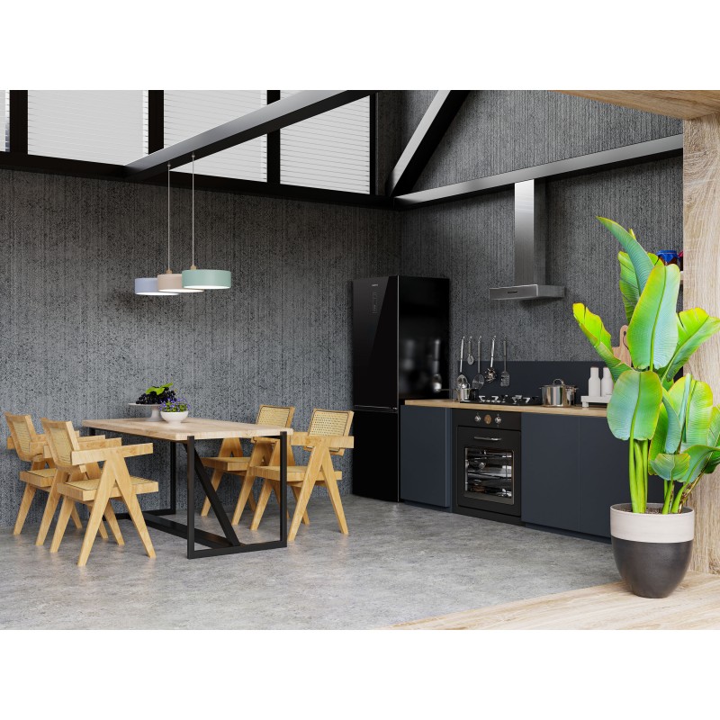 Стильний скляний фасад холодильника чорного кольору надає йому вишуканого вигляду, через що розміщувати його можна хоч у вітальні. Вбудовані ручки доповнюють лаконічність дизайну і великі розміри холодильника не створюють відчуття надмірної масивності.