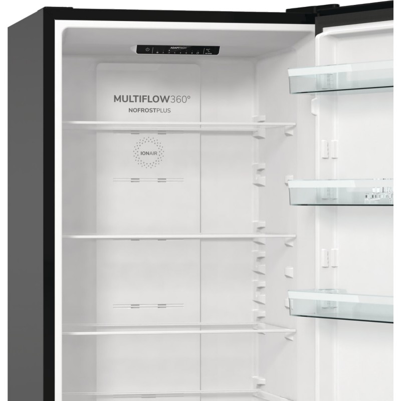Технологія IonAir створює негативно заряджені іони в приладі, які рівномірно розподіляються в холодильній камері за допомогою нової системи MultiFlow 360°. Збагачене цими аніонами повітря сприяє збереженню аромату продуктів і усуває неприємні запахи.