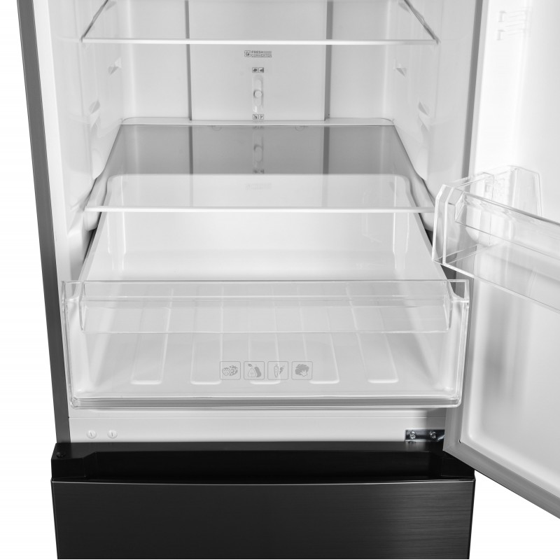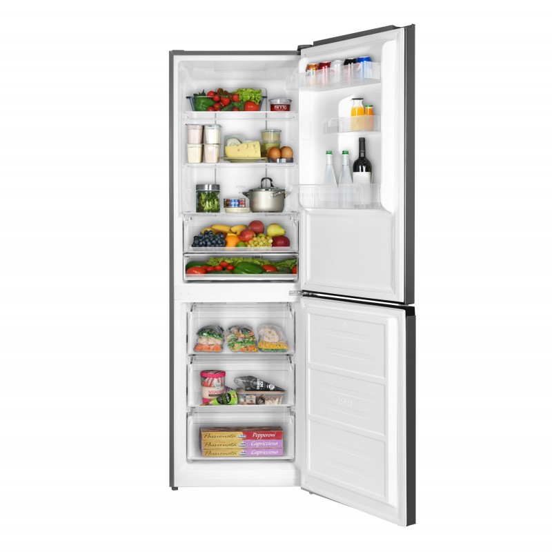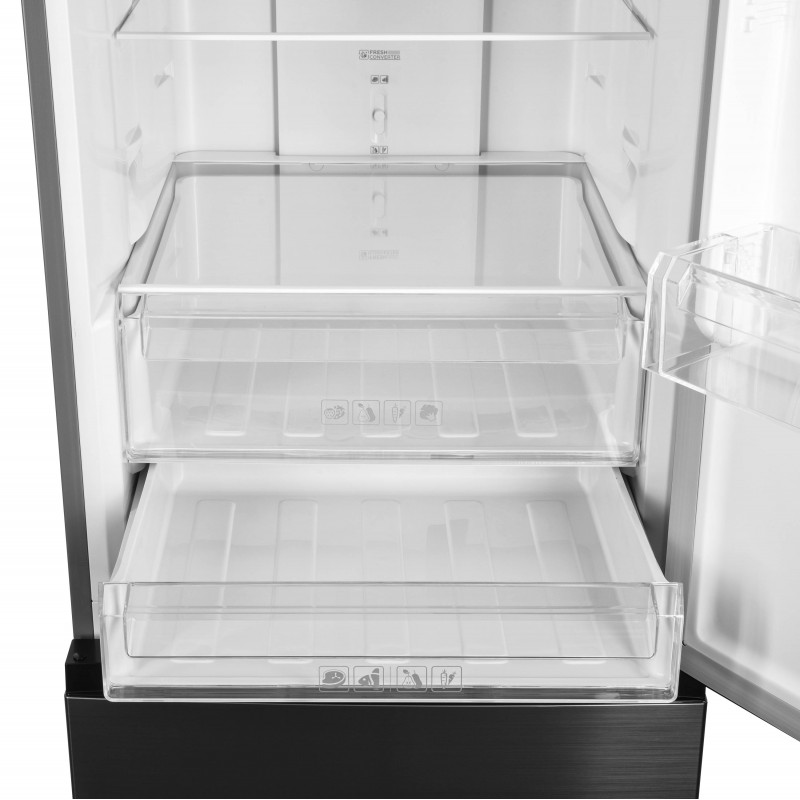 Технологія Total No Frost підтримує швидке та рівномірне охолодження продуктів без утворення інію чи конденсату на внутрішніх стінках камер, а також пригнічує утворення плісняви та бактерій. Із Total No Frost продукти в холодильнику зберігаються за правильної температури та вологості і можна забути про розморожування вручну. Холодоагент, який використано для ефективної роботи пристрою, – R600a. Розмір моделі 600 × 665 × 1 840 мм, вага 63 кг.