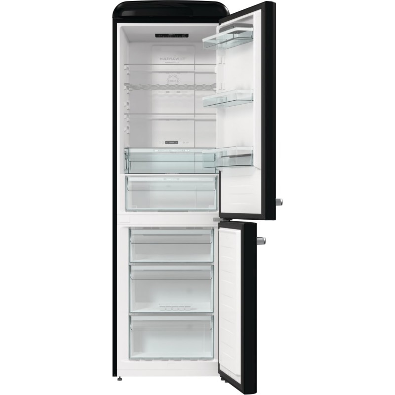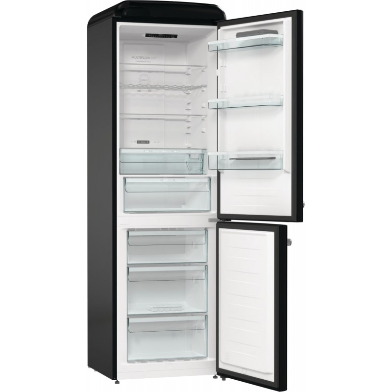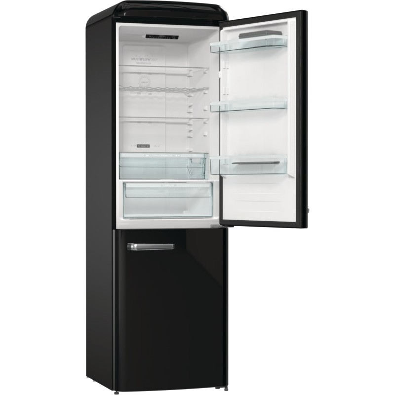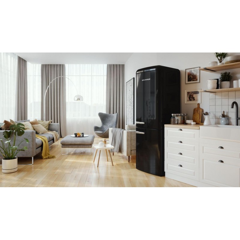 Холодильник Gorenje ONRK619DBK — це втілення стилю та функціональності. Його ретро-дизайн з чорним глянцевим покриттям і хромованими деталями додає естетики будь-якій кухні. Загальний об’єм у 300 літрів розподілений між холодильним відділенням (204 л) та морозильною камерою (96 л), що дозволяє зручно зберігати різноманітні продукти.