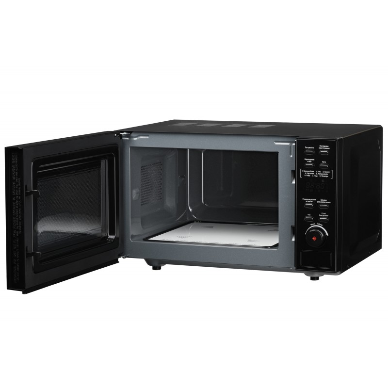 Нижнє розташування магнетрону та відсутність поворотного столу забезпечують рівномірне розподілення мікрохвиль та можливість використання посуду будь якої форми. Для відкриття дверцят є клавіша, а для управління – вісім кнопок та поворотний перемикач. Клавіші відповідають за різні режими та налаштування, а перемикач – за регулювання часу та вибору програми приготування.