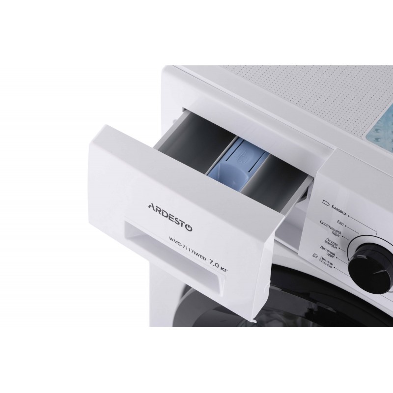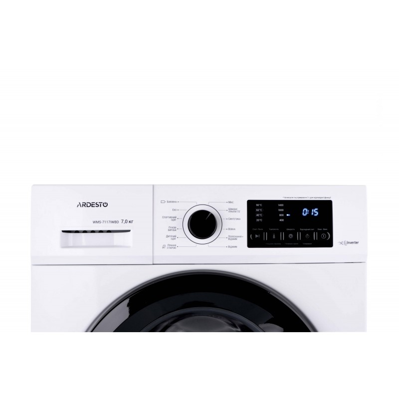 Модель WMS-7117IWBD має інтуїтивно зрозумілий дисплей і підсвічування барабана. Програми: прання з парою, бавовна, еко, спорт, спідня білизна, вовна, пухо-пір’яні вироби, віджим, полоскання і віджим, експрес 15´, делікатне прання, синтетика, мікс. Передбачено режими відкладеного прання, очищення барабана та функція блокування від дітей. Розмір 595 × 480 × 850 мм. Вага 60 кг.а ARDESTO фронтальна, 7кг, 1400, А+++, 48см