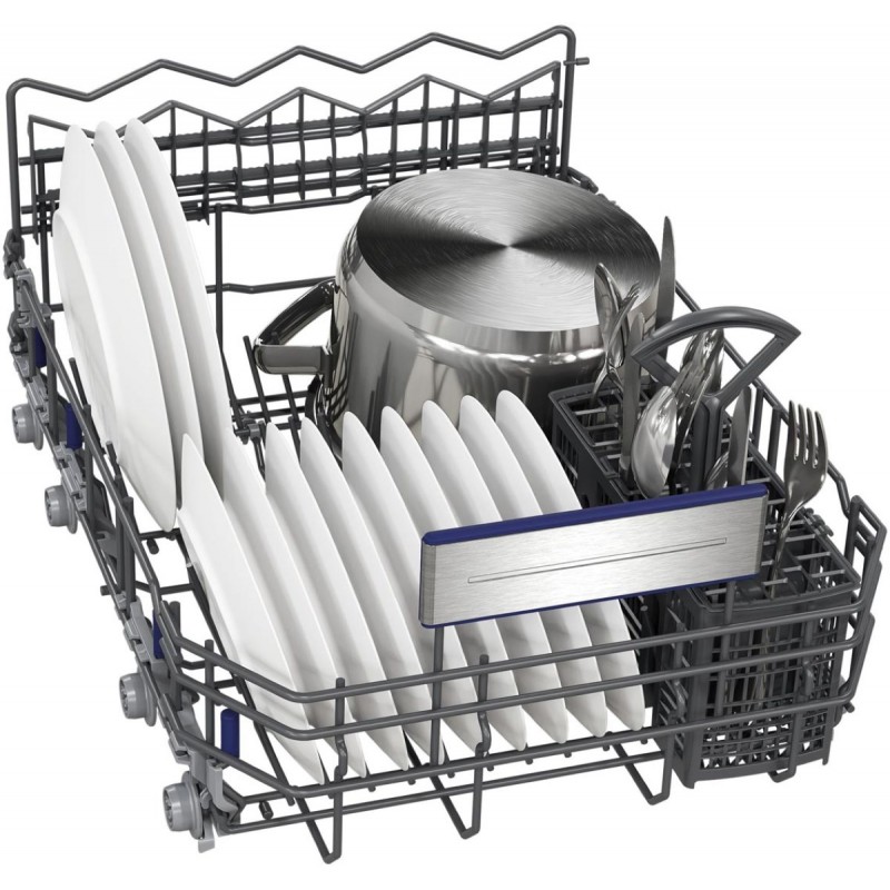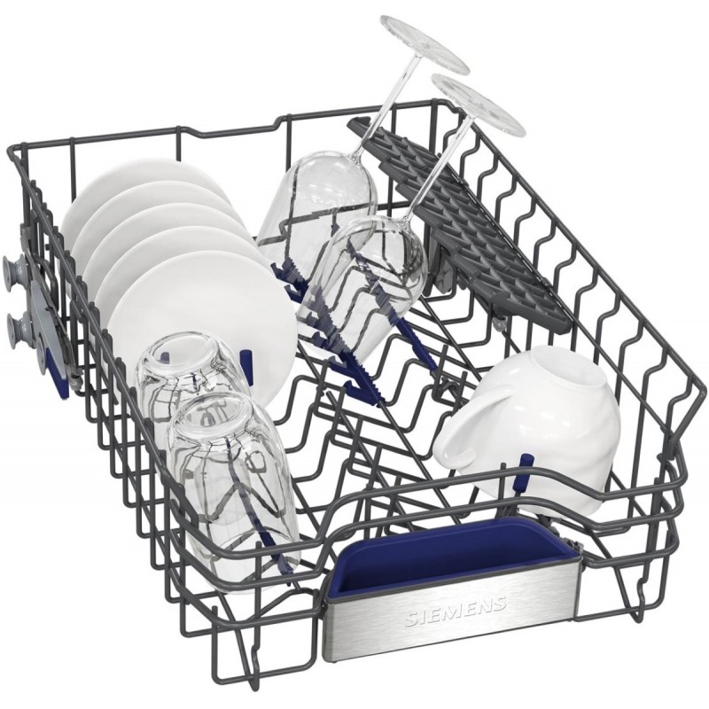 Позначення регулювання синього кольору всередині посудомийної машини дозволяють відразу побачити всі можливі налаштування кошика. Великі каструлі можна швидко завантажити до приладу, а келихи для вина та шампанського розташовані більш надійно.