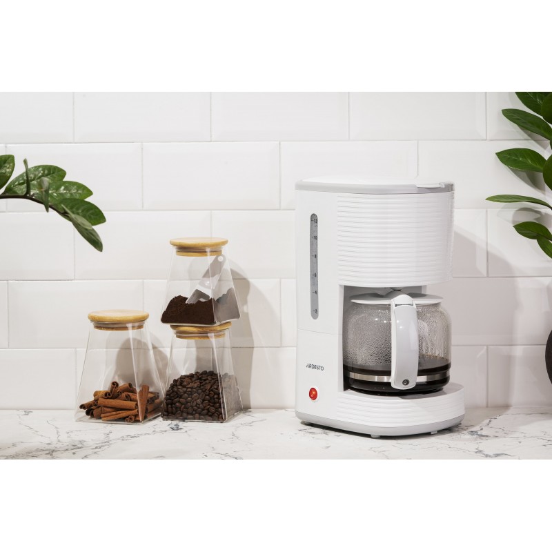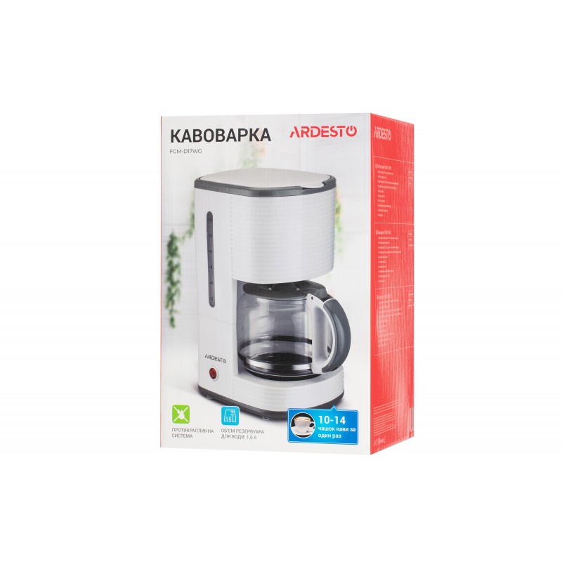 Крапельна кавоварка Ardesto FCM-D17WG призначена для побутового використання – приготування кави для співробітників магазинів, офісів, у готелях або вдома. За один раз вона зможе приготувати ароматну каву для 10-14 осіб. Об’єм кавника, що виготовлено зі скла, становить 1,5 л. Про кількість води повідомить індикатор. Для приготування смачної кави потрібно використовувати чисту, холодну питну воду. Пристрій оснащено протипригарною пластиною для підігріву кавника, що вмикається автоматично під час приготування.