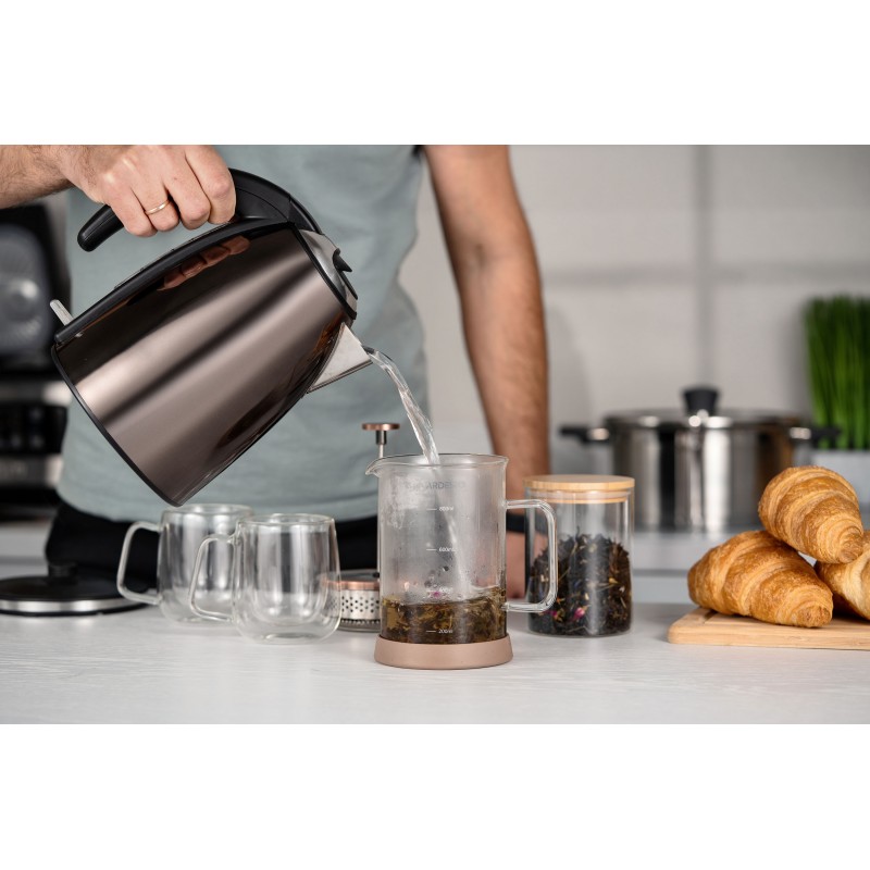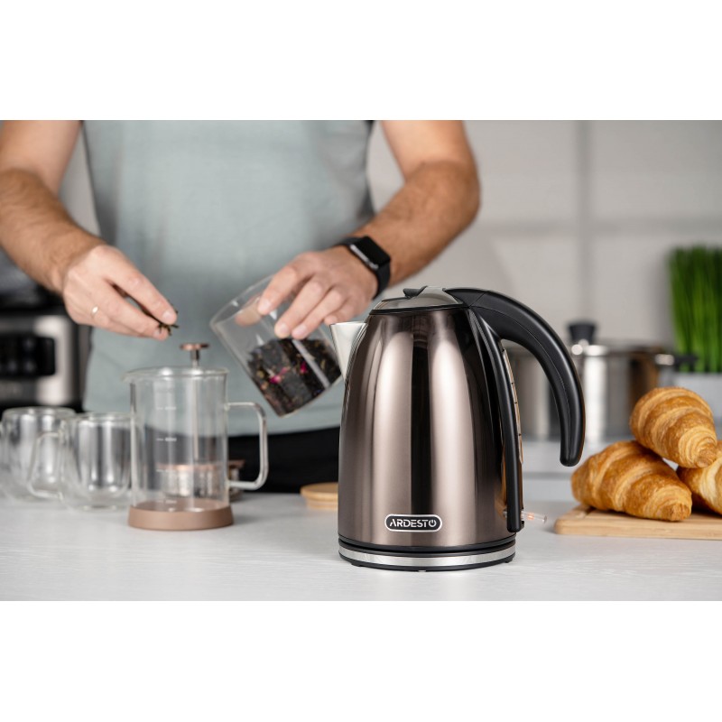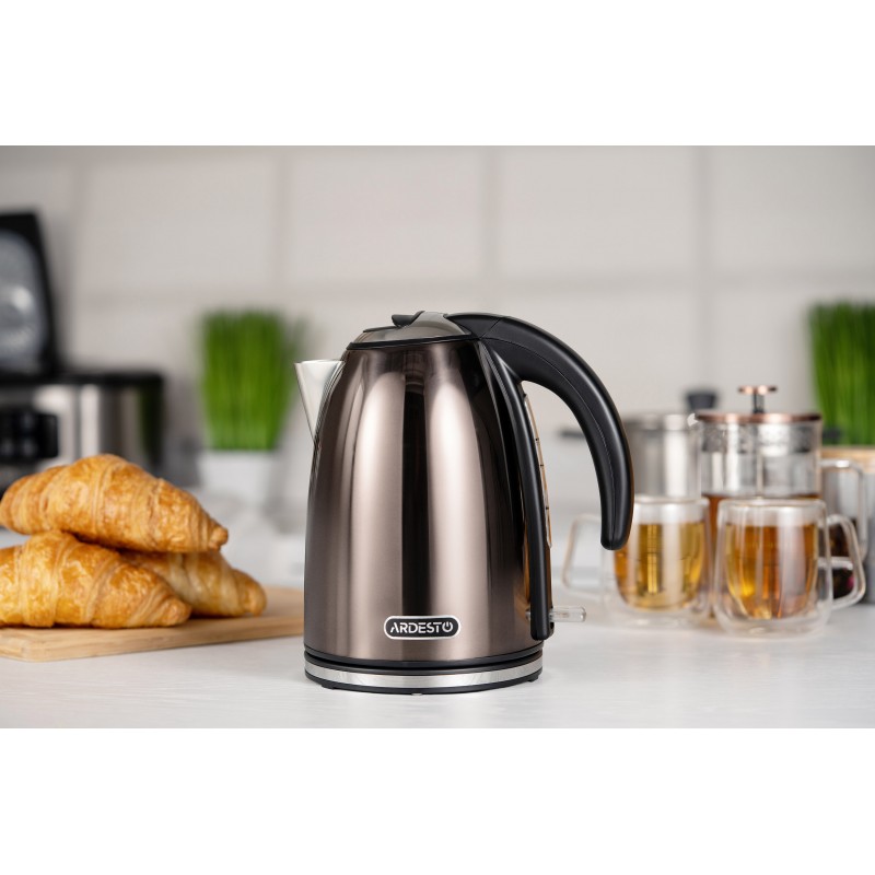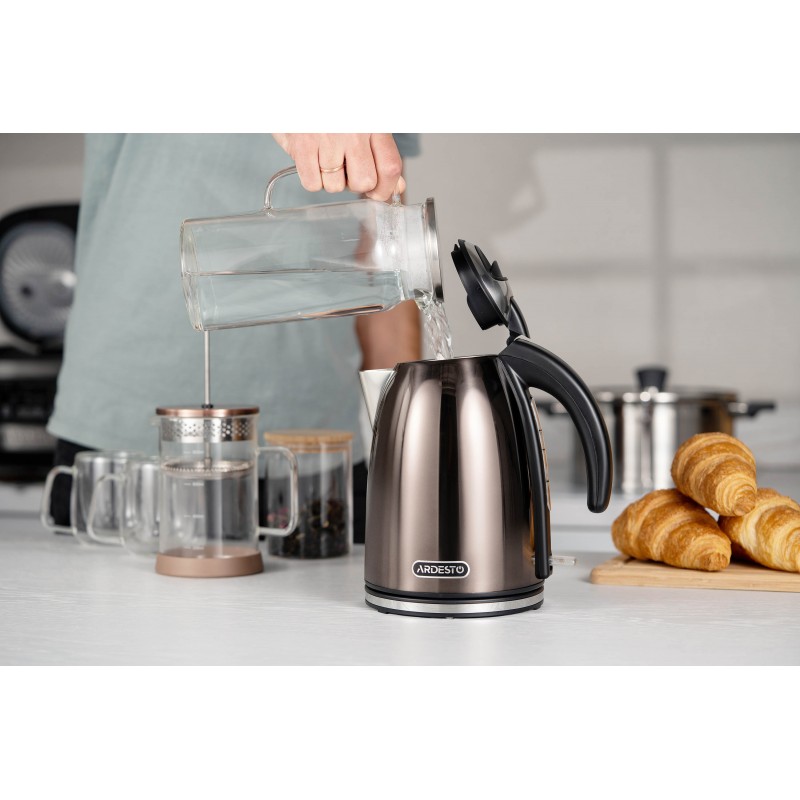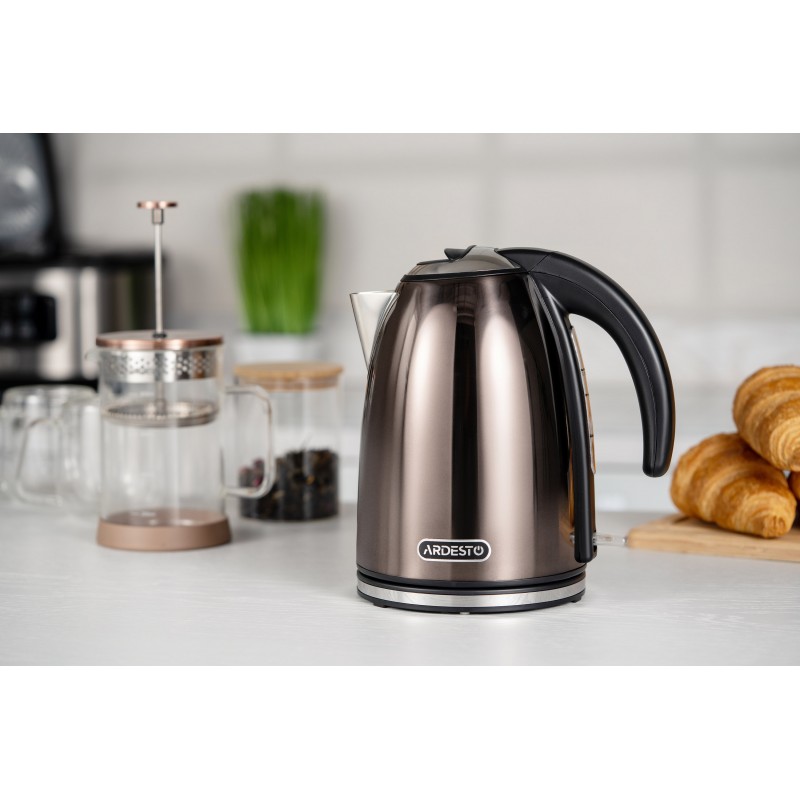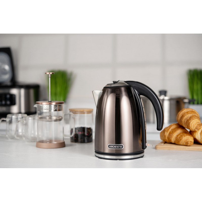 Завдяки трендовому бронзовому кольору ARDESTO EKL-F340BRZ пасуватиме будь-якій кухні. Модель виготовлено з міцного матеріалу – нержавіючої сталі, тому електрочайник довго матиме гарний вигляд. Виробник застосував дизайнерський підхід, оснастивши модель світловим індикатором на клавіші вмикання. Чітка шкала рівня води забезпечує гарну видимість кількості рідини в чайнику.