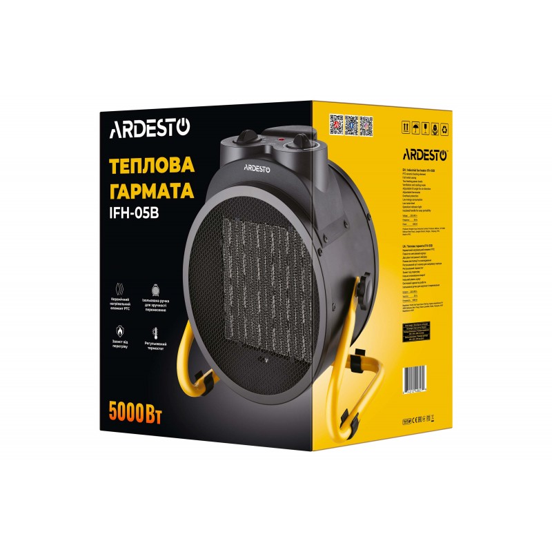 Підлоговий обігрівач ARDESTO IFH-05B потужністю 5000 Вт стане в нагоді для обігріву гаражів, майстерень чи на будівельних майданчиків. Ефективно та швидко впорається з обігрівом приміщень площею до 50 м2, завдяки керамічному нагрівальному елементу PTC.