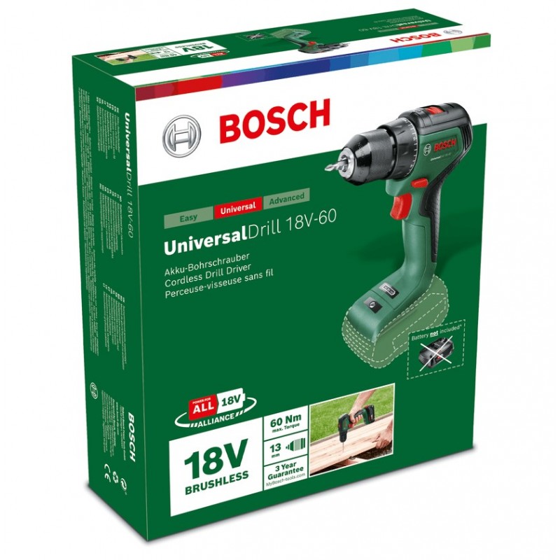Bosch Шурупокрут-дриль акумуляторний UniversalDrill 18V-60 18В 60Нм 0-500·0-1900об·хв без АКБ та ЗП 1.3кг