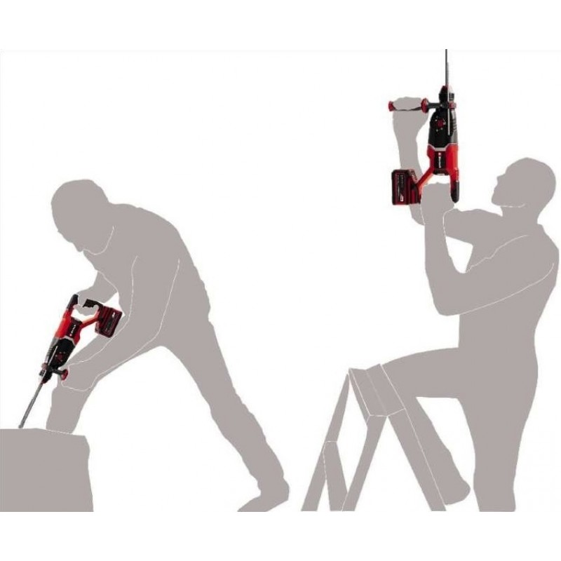 Пневматичний ударний механізм працює з частотою до 5100 ударів за хвилину та потужністю 2,6 джоуля, завдяки високій продуктивності свердління перфоратор може свердлити отвори діаметром до 26 мм у бетоні. Напівавтоматичний патрон SDS-Plus полегшує швидку зміну інструменту. D-подібна рукоятка гасить вібрації та полегшує вертикальне свердління та довбання. Це означає, що перфоратором можна безпечно керувати та застосовувати правильний тиск. Універсальний напівавтоматичний патрон SDS-Plus забезпечує просту та швидку заміну аксесуарів. Електронний курок перфоратора Einhell TP-HD 18/26 D Li BL - Solo дозволяє регулювати оберти двигуна в залежності від ступеня натискання. Завдяки ергономічній частині ручки з м’якою накладкою перфоратором комфортно працювати. Міцний обмежувач глибини свердління для точного свердління плавно регулюється. Акумуляторний перфоратор TP-HD 18/26 D Li BL оснащений світлодіодним підсвічуванням для оптимального освітлення робочої зони. Інструмент поставляється в практичному кейсі E-Case для транспортування та зберігання. Поставляється без акумулятора і зарядного пристрою, вони доступні окремо. Для оптимальної роботи рекомендуємо використовувати акумулятор ємністю 3,0 Аг чи більше.