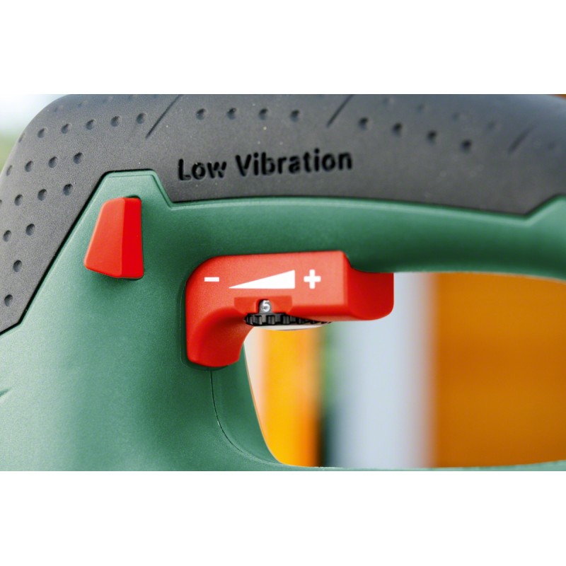 | Особливі властивості | Маятниковий хід полотна, Вбудована підсвітка, Вентилятор для видалення пилу, регулювання числа обертів, Зміна полотна без інструментів, Відсік для пилок, Регулювання струменя повітря, Рукоятка з м'якою накладкою, Bosch CutControl |