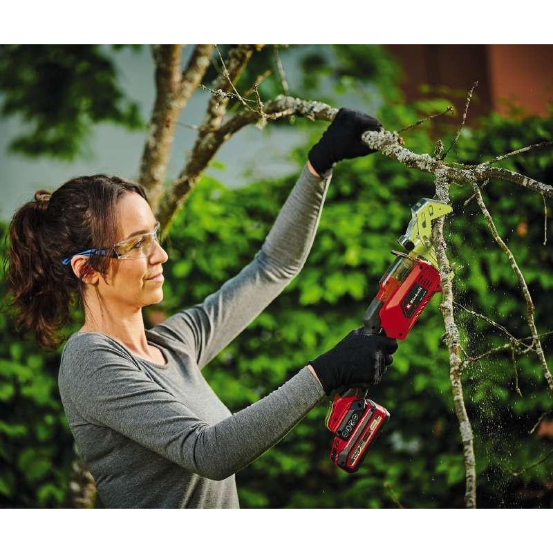 Пильне полотно обрізної пили довжиною 150 мм дозволяє обрізати навіть дуже товсті гілки з діаметром до 100 мм без зусиль, а при використанні насадки для гілок, гілки з діаметром до 80 мм. Для безпечного пиляння однією рукою Обрізна пила Einhell GE-GS 18/150 Li - Solo має знімну насадку для гілок, яку можна знімати без інструментів, що забезпечує кращу фіксацію під час обрізки та запобігає ковзанню. Зйомна насадка для гілок дозволяє легко розрізати гілки, отже, сприяє невтомній роботі. Для захисту акумулятора пила оснащена антивібраційним роз’ємом для акумулятора, що зменшує передачу вібрацій на акумулятор. Тонкий, ергономічної форми та легкий садовий інструмент вагою 1,8 кг добре лежить у руці завдяки м’якій ручці навіть під час тривалого використання. За допомогою кліпси для пояса пилу можна швидко та безпечно зберігати на поясі під час перерв у роботі. Максимальна безпека при поводженні з акумуляторною пилою забезпечується захисною кришкою тримача пильного полотна і запобіжним вимикачем з обох сторін, що запобігає випадковому включенню. Обрізна пила Einhell GE-GS 18/150 Li - Solo постачається з двома полотнами kwb "Made in Switzerland". Інструмент поставляється без акумулятора і зарядного пристрою, але він може бути приведений в дію за допомогою Power X-Change акумулятора.