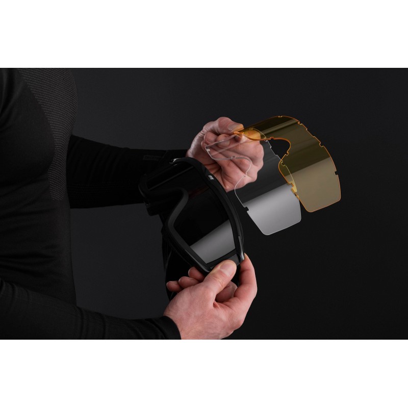 - Три змінні ударостійкі лінзи: для блокування відблисків і зниження напруги очей за яскравого освітлення (сіра); для носіння за слабкого освітлення чи в похмуру погоду із захистом від шкідливого для очей випромінювання (прозора); для чіткішої та контрастнішої видимості об’єктів, фільтрує синє світло (жовта)