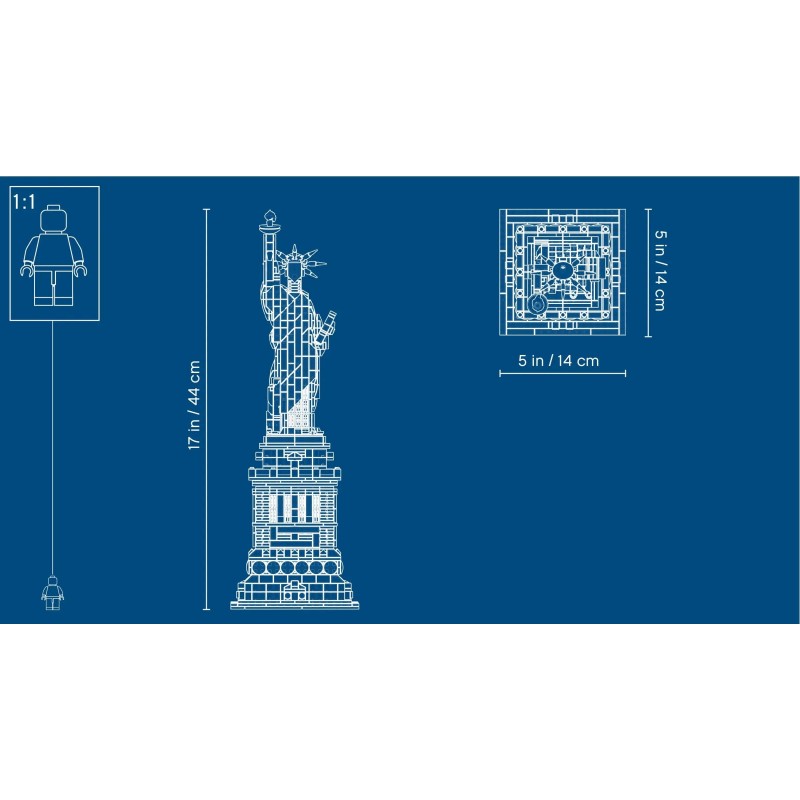 Ця статуя є символом свободи. Вона була передана народу Сполучених Штатів як подарунок від французького народу; офіційна церемонія передачі відбулася 28 жовтня 1886 на очах у багатотисячного натовпу. Деталізована модель відображає гармонійне поєднання архітектури та скульптури статуї, відрізняється відпрацьованим п'єдесталом зі щитом, ретельною деталізацією та балконами на колонах. Статуя свободи одягнена в робу, що розвівається, розбиті кайдани і 7-променеву корону. У лівій руці вона тримає скрижаль, а в правій — золотий смолоскип. Ця елегантна модель LEGO Architecture виконана в автентичній світло-зеленій з бежевим кольором і прикрашена декоративною пластиною.