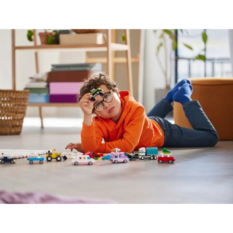 За допомогою 900 будівельних кубиків, спеціальних деталей та 52 коліс, а також простих інструкцій діти можуть побудувати поліцейський автомобіль, фургон із морозивом, квадроцикл, фронтальний навантажувач, вантажівку, універсал, позашляховик та лімузин. Потім, використовуючи ідеї для різних дизайнів, круті деталі та яскраві прикраси, діти можуть перебудовувати свої транспортні засоби у новий цікавий спосіб. З розвитком творчих навичок конструювання діти можуть братися й за власні проєкти. Для натхнення до набору включено 10 творчих ідей, які дадуть поштовх для веселого вільного будування.