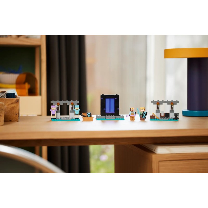 У наборі є три середовища для дослідження: робоча зона з ковадлом, піччю, точилом і наповненим лавою казаном; кімната для демонстрації обладунків зі скринею, що містить золоту сокиру, зачарований тризуб, незеритовий меч, щит та інші ресурси Minecraft; а також портал у Нижній світ із дверцятами, що відчиняються й ведуть гравців до наступної пригоди. Ця пригодницька іграшка Minecraft також є чудовим додатковим набором для сюжетної гри, який легко поєднується з іншими наборами LEGO Minecraft, зокрема з набором «Засідка біля порталу в Нижній світ» (21255), що продається окремо.