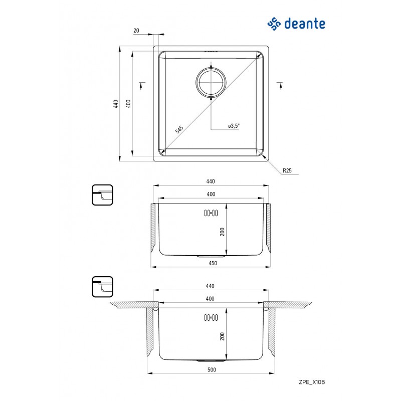 Deante Мийка кухонна Egeria, нерж.сталь, квадрат, без крила, 440х440х200мм, чаша - 1, врізна+накладна, нерж