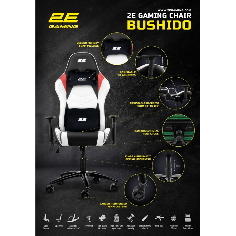 Крісло 2E GAMING BUSHIDO II Black – стильна чорна класика в усій красі. Таке крісло чудово пасуватиме до ігрової кімнати чи офісного кабінету. Стриманий дизайн, ніби створений, щоби зосередитися на головному.