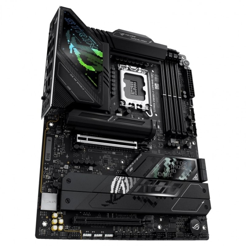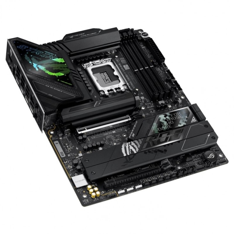 The ROG Strix Z890-F is sleek and understated for seamless integration with a wide range of system components. Its deep black surface and matching metallic heatsinks create a dark, intense look, while the Polymo lighting on the I/O shroud offers customizable RGB effects – so you can choose between a subtle appearance or a bold, eye-catching statement.