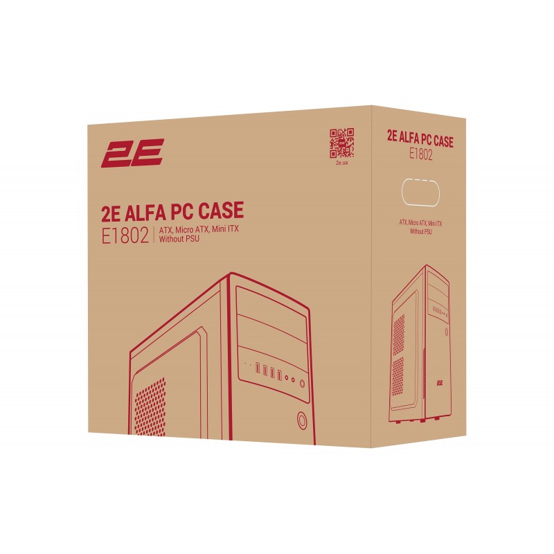 2E ALFA E1802 гарний варіант для складання універсальної домашньої або офісної системи, а також бюджетної, середнього рівня робочої станції. Корпус надає можливості монтажу достатньої кількості накопичувачів та численних плат розширення (7 слотів розширення), відеоадаптера завдовжки до 320 мм. У корпусі передбачено простір для акуратного розміщення кабелів, можна встановити до 5 вентиляторів, охолодження для процесора висотою не більше 148 мм.