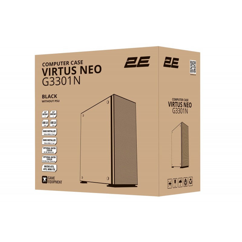 Корпус 2E GAMING Virtus Neo G3301N підходить для збірки домашнього ПК і потужної ігрової системи, має стильний дизайн і активну вентиляцію. Максимально можлива довжина відеокарти – 340 мм. Корпус надає можливість монтажу достатньої кількості накопичувачів і багаточисельних плат розширення (7 слотів розширення). Передбачена установка 6-ти вентиляторів (на верхню панель, до вже чотирьох встановлених) і охолодження для процесора висотою до 178 мм. Корпус адаптований для можливості монтажу системи рідинного охолодження на передній панелі – радіатори 120/240мм, на задній – один 120мм і на верхній – радіатори 120/240мм, додатково передбачено простір для зручного розміщення кабелів. На верхній панелі розміщений пиловий магнітний фільтр, додатково стандартний пиловий фільтр на нижній панелі.