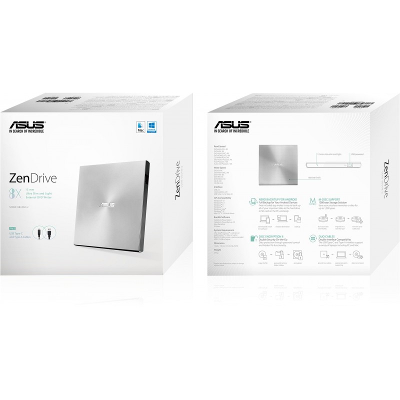 ASUS Привід оптичний портативний SDRW-08U9M-U DVD+-R/RW burner M-DISC USB2.0 Slim срібний Retail Box