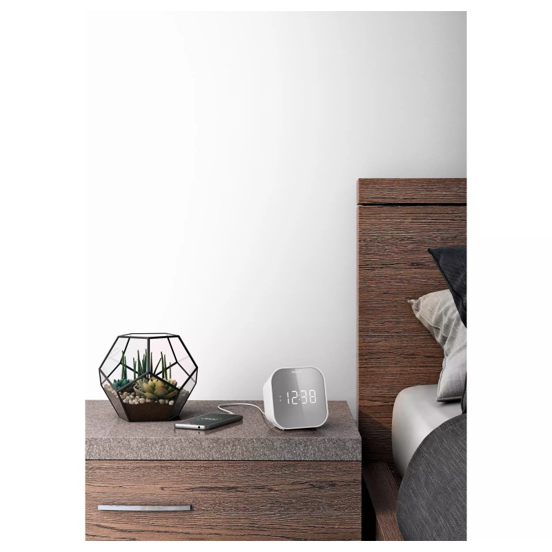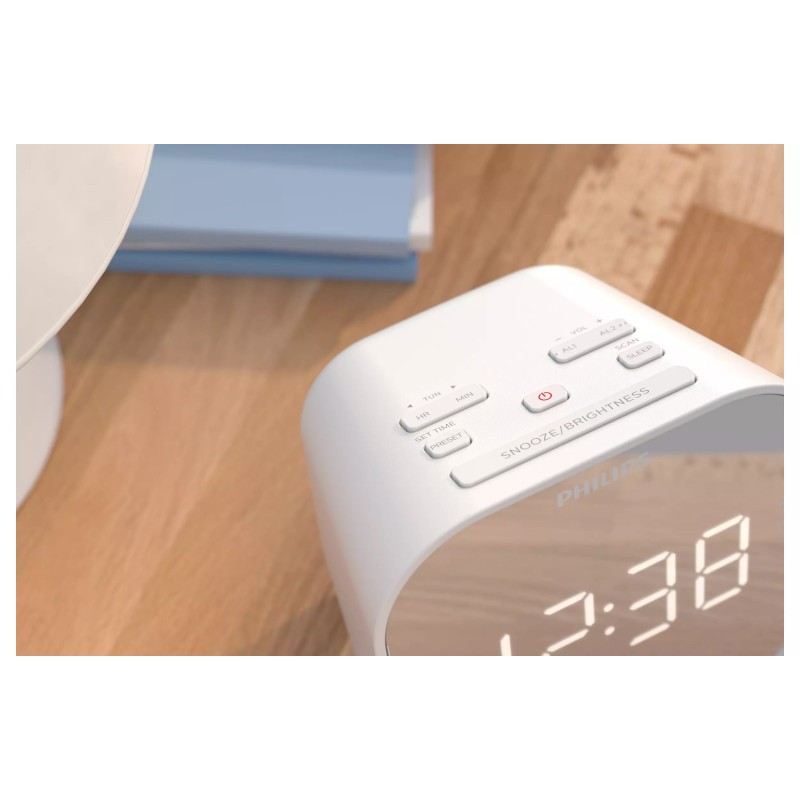 Миттєво дізнавайтеся час завдяки цьому радіогодиннику FM із будильником. Великі цифри дозволяють легко побачити дисплей із дзеркальним покриттям з будь-якого кута, і ви можете налаштувати яскравість відповідно до кімнати. Прості елементи керування дозволяють налаштувати будильник, гучність і радіостанції.