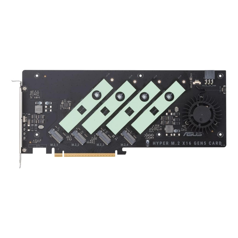 The ASUS Hyper M.2 x16 Gen5 Card has four M.2 slots - supporting both PCIe 5.0 and 4.0 — that allow users to supplement entire Designed for latest-generation NVMe drives, the card features a stable power supply that provides up to 14 watts of power per drive. The card also supports RAID functions across four M.2 slots ,providing up to 128 GT/s bandwidth per M.2 slot.