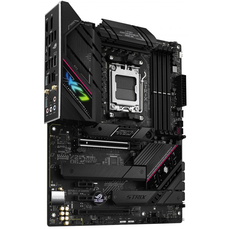 Темна гама кольорів цієї плати підкреслюється яскравими деталями та логотипом з регульованим RGB-підсвічуванням. Поєднання стилю та функціональності ілюструє кожух інтерфейсів із вирізами, через які додатковий повітряний потік проходить у канали поруч розташованого радіатора VRM. Створіть унікальну ігрову збірку, що відображатиме ваш особистий стиль, поєднавши Strix B650E-F з іншими продуктами багатої екосистеми ROG.